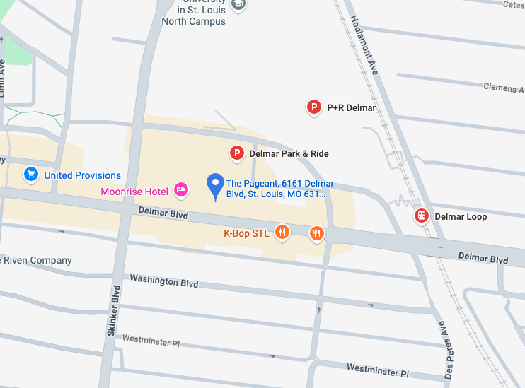 Once you arrive, FREE parking is available directly behind The Pageant as well as in the MetroLink Delmar Station Park-n-Ride lot. Follow the walkway south from the Delmar Station parking lot to the front of The Pageant and Delmar Hall. Street parking is also available throughout the surrounding area.